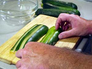 Snij het uiteinde van de courgettes af en snij de courgettes in mooie stukken van gelijke grootte (zodat ze tegelijkertijd gaar worden).