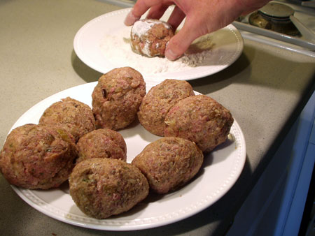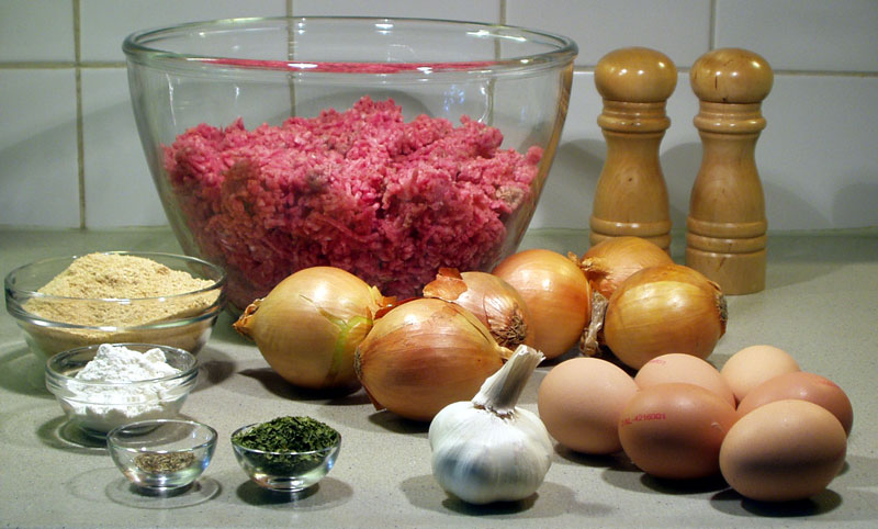 Het gehakt kan gemengd worden met de gebakken uien, de eieren, peterselie, oregano, knoflook en paneermeel (of broodkruimels). Verder op smaak brengen met gemalen zwarte peper.